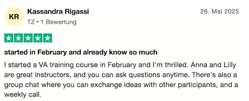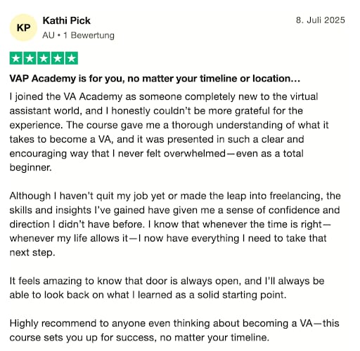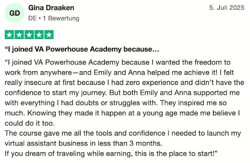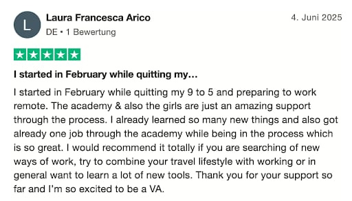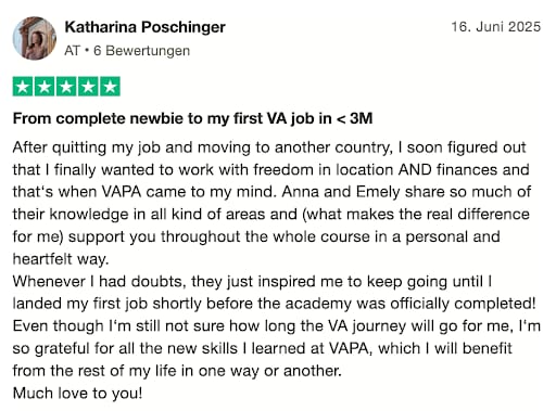 Now: I am working as a video editor and Admin-VA for two different clients. In the Academy I learned about Marketing, Social Media Growth, Copywriting, Content Creation and how to set up my own business.